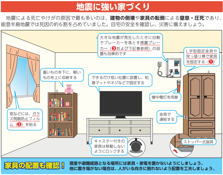 - ガラスや食器が入った棚及び家具等は、必ず転倒防止を行ってください