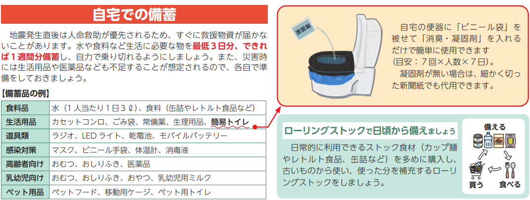 - トイレが利用出来ない場合に備え、簡易トイレを準備して下さい