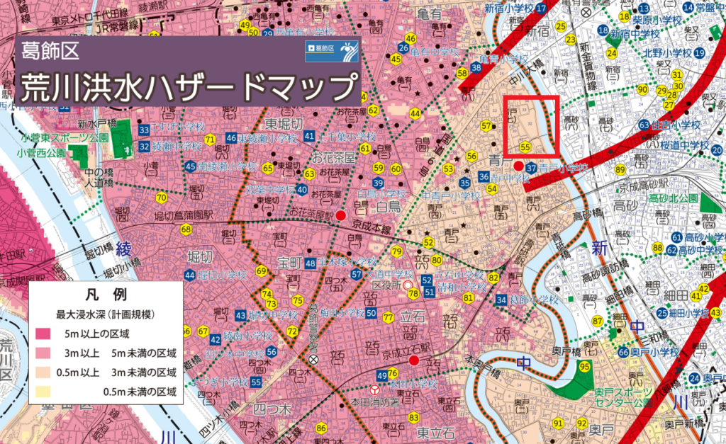 荒川および中川の洪水について、現時点で出来うる対策を講じる。葛飾区ハザードマップ(令和4年7月発行)より当マンション付近の影響想定は以下のとおり。
